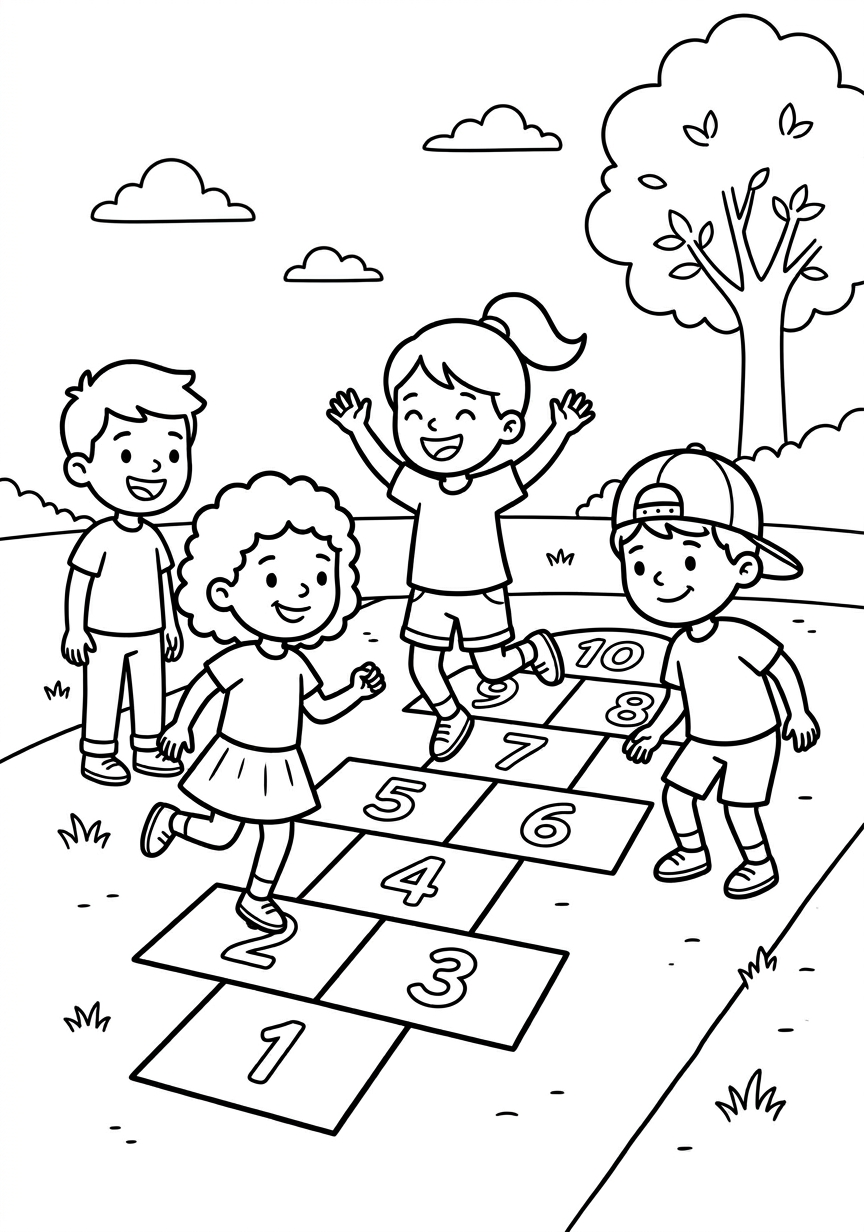 Em contextos pedagógicos, o material pode ser incluído em propostas sobre brincadeiras antigas, sequências numéricas ou atividades que envolvam movimento e organização espacial. Dessa forma, o desenho deixa de ser apenas uma atividade de colorir e passa a ser um recurso educativo versátil e eficaz.
